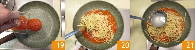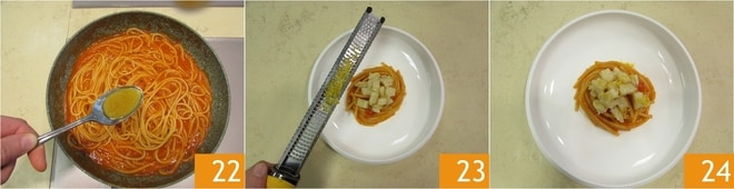 Gießen Sie die Paprikacreme in die Pfanne 19 und erhitzen Sie sie. Lassen Sie die Spaghettoni al dente abtropfen und geben Sie sie in die Pfanne 20, wobei Sie etwas Kochwasser aufbewahren, das gleich hinzugefügt wird 21.