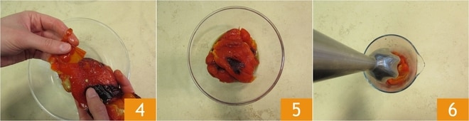 Schälen Sie sie 4 und entfernen Sie die inneren Samen. Geben Sie sie nach und nach in einen hohen, schmalen Behälter 5. Pürieren Sie sie nun mit einem Stabmixer 6.