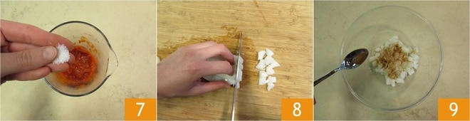 Sobald eine homogene Creme entstanden ist, salzen Sie sie 7 und stellen Sie sie beiseite. Wenden Sie sich nun dem Kabeljau zu, schneiden Sie ihn in Würfel 8 und geben Sie ihn in eine Schüssel. Fügen Sie etwas Chilipulver hinzu 9.