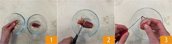 Um die Spaghettoni mit rohen Garnelen vorzubereiten, entfernen Sie den Kopf 1 und trennen Sie mit einer Schere die Augen, die bitter wären. Sammeln Sie diese nach und nach in einer kleinen Schale. Entfernen Sie dann auch das Panzer, ebenfalls mit den Händen. Sobald Sie die Garnelen gereinigt haben, ziehen Sie auch den schwarzen Faden mit einem Zahnstocher heraus 3.