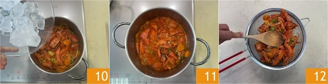 Geben Sie Eis hinzu 10 und lassen Sie es bei mittlerer Hitze 40 Minuten kochen 11. Nach dieser Zeit sieben Sie die Mischung und drücken Sie mit dem Rücken eines Löffels 12, um alle Säfte herauszupressen.
