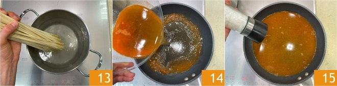 Kochen Sie die Pasta in reichlich gesalzenem Wasser 13 für 3 Minuten. In der Zwischenzeit geben Sie den Sud in eine Pfanne 14 und würzen Sie mit Salz 15.