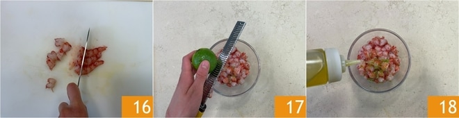 Nehmen Sie die Garnelen und schneiden Sie sie grob 16. Geben Sie sie in eine Schale, würzen Sie sie mit der abgeriebenen Schale einer halben Limette 17 und einem Schuss Öl 18.
