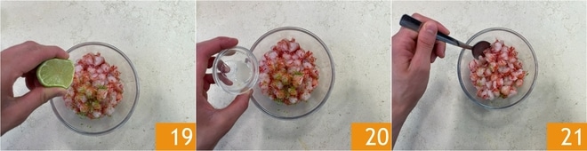 Fügen Sie auch den Saft einer halben Limette hinzu 19, eine Prise Salz 20 und mischen Sie 21. Stellen Sie sie in den Kühlschrank.