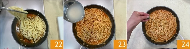 Gießen Sie die Spaghetti ab und geben Sie sie in die Pfanne mit dem Sud 22; kochen Sie sie fertig, indem Sie das Kochwasser hinzufügen 23. Schalten Sie die Hitze aus, geben Sie einen Schuss Öl hinzu und fügen Sie die gehackte Petersilie hinzu 24.