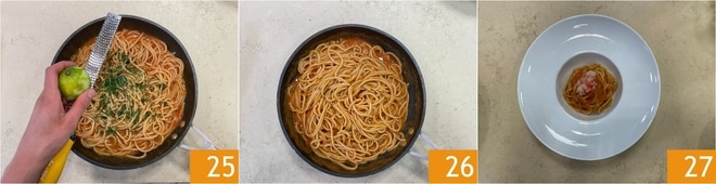 Fügen Sie noch etwas Limettenschale hinzu 25 und mischen Sie die Pasta gut 26. Servieren Sie sie, indem Sie die rohen Garnelen oben drauf legen 27.