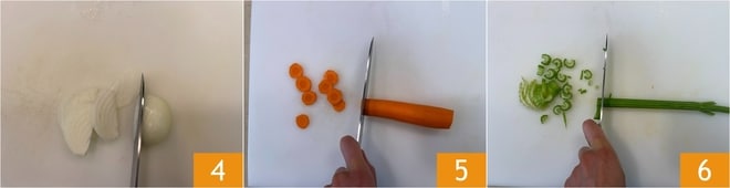 Schälen Sie die Zwiebel und schneiden Sie sie in Scheiben 4. Machen Sie dasselbe mit Karotten 5 und Sellerie 6.