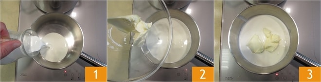 Um die Spaghettoni mit Scimudin-Fondue zuzubereiten, stellen Sie zuerst einen Topf mit gesalzenem Wasser auf den Herd, der zum Kochen der Pasta dient. Nun zur Fondue: Gießen Sie die Sahne 1 und die Butter 2 in einen kleinen Topf. Erhitzen Sie alles, bis es kocht 3.