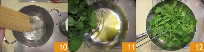 Werfen Sie die Spaghettoni in das Wasser, das nun kocht 10. In der Zwischenzeit geben Sie etwas Öl und den Spinat in eine heiße Pfanne 11. Braten Sie sie einige Minuten an, ohne sie vollständig welken zu lassen 12.