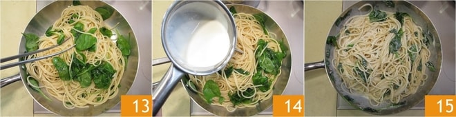 Wenn die Spaghetti al dente sind, seihen Sie sie ab und geben Sie sie direkt in die Pfanne mit dem Spinat 13. Fügen Sie auch die Fondue hinzu 14 und schwenken Sie die Spaghetti 15.