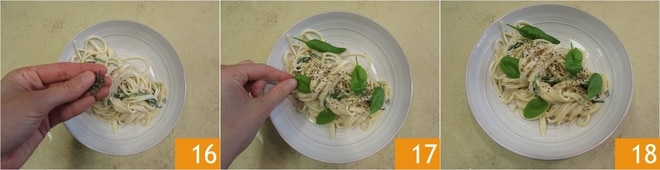 Nun richten Sie das Gericht an: Legen Sie die Spaghettoni auf einen Teller. Fügen Sie etwas von der restlichen Fondue aus der Pfanne hinzu, bestäuben Sie mit Pesteda 16 und geben Sie noch ein paar frische Spinatblätter darauf 17. Die Spaghettoni mit Scimudin-Fondue sind servierfertig 18. Genießen Sie sie sofort!