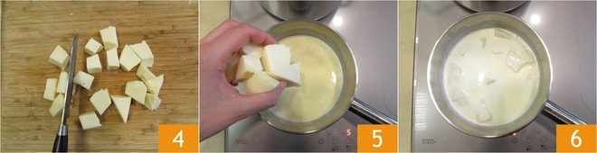 Schneiden Sie inzwischen den Käse in Würfel 4. Sobald die Sahne den Siedepunkt erreicht hat, schalten Sie die Hitze aus und lassen Sie die Temperatur etwa 1 Minute lang sinken. Fügen Sie den Scimudin zur Sahne hinzu 5 und lassen Sie es einige Minuten ruhen 6. Es ist wichtig, die Temperatur der Sahne sinken zu lassen, um eine weitere Käsebildung zu vermeiden.