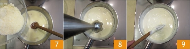 Fügen Sie auch den geriebenen Parmesan hinzu 7 und pürieren Sie alles mit einem Stabmixer 8, um eine homogene und samtige Creme zu erhalten.