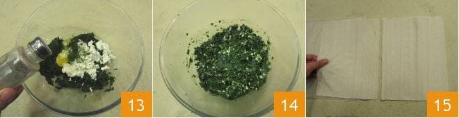 Pfeffern Sie 13 und mischen Sie, um die Mischung gut zu verbinden 14. Heizen Sie den Ofen im statischen Modus auf 180° vor. Nehmen Sie den Filoteig und trennen Sie ihn, um zwei Blätter zu erhalten, die jeweils aus 3 Schichten Teig bestehen 15.