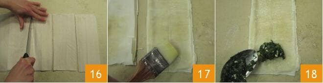 Teilen Sie jedes dieser Blätter in 4 Streifen von etwa 10 cm Breite, die dann die Form eines Rechtecks haben 16. Schmelzen Sie die Butter in einem kleinen Topf und bestreichen Sie die Oberfläche jedes Rechtecks mit der geschmolzenen Butter 17. Nehmen Sie einen Löffel der Spinatmischung und legen Sie ihn an die Basis eines der Rechtecke 18,