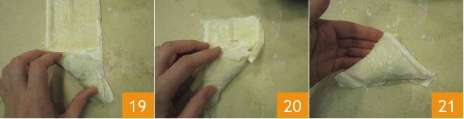 falten Sie dann den Teig, um die Füllung zu bedecken und bringen Sie die Basis mit einer der Seiten in Übereinstimmung, um ein Dreieck zu formen 19; Fahren Sie fort, den Teig auf diese Weise zu falten, bis Sie das Ende des Rechtecks erreicht haben 20. Drücken Sie sanft, um das Päckchen zu versiegeln 21 und legen Sie sie nach und nach auf ein mit Backpapier ausgelegtes Backblech, mit der Öffnung nach unten.