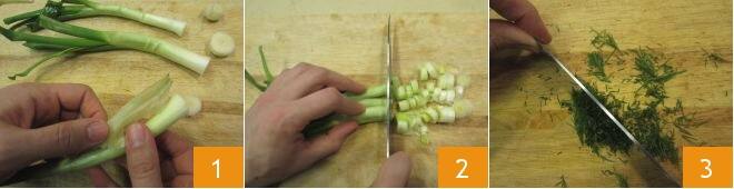 Um die Spanakopitakia zuzubereiten, reinigen Sie zuerst das Gemüse: Spülen Sie die Frühlingszwiebeln ab, schneiden Sie die Basis ab, entfernen Sie die äußerste Schicht 1 und schneiden Sie sie in Ringe 2. Dann hacken Sie den Dill fein 3 und spülen den Spinat unter fließendem Wasser ab.
