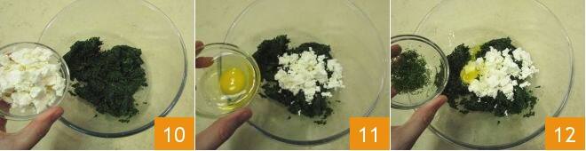 Geben Sie den gehackten Spinat in eine Schüssel, fügen Sie den mit der Hand zerbröselten Feta 10, ein Ei 11 und den gehackten Dill 12 hinzu.