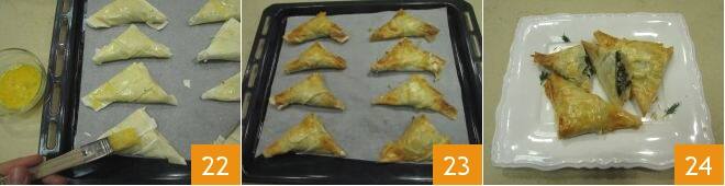Bestreichen Sie die Päckchen mit dem verquirlten Ei 22 und backen Sie sie im statischen Ofen bei 180° für etwa 20 Minuten, bis sie schön goldbraun sind 23. Ihre Spanakopitakia sind bereit, um genossen zu werden 24!