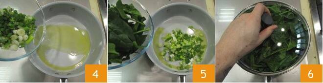 Erhitzen Sie das Öl in einer Pfanne, fügen Sie die Frühlingszwiebeln 4 und den Spinat 5 hinzu, decken Sie mit einem Deckel ab 6 und kochen Sie bei mittlerer Hitze für 10 Minuten.