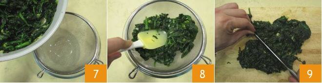 Wenn der Spinat gar ist, geben Sie ihn in ein Sieb, das über einer Schüssel platziert ist 7, und drücken Sie mit einem Spatel, damit überschüssiges Wasser austritt 8. Dann geben Sie den Spinat auf ein Schneidebrett und hacken ihn fein mit einem Messer 9.