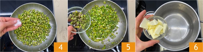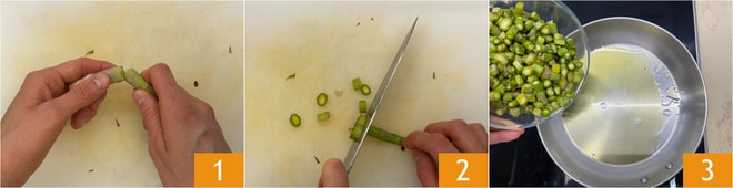 Um die Spargel-Lasagne zuzubereiten, kümmern Sie sich zuerst um die Wie man Spargel putzt: Entfernen Sie den holzigsten Teil 1 und schneiden Sie die Stängel in Rauten 2, lassen Sie die Spitzen intakt. Erhitzen Sie einen Schuss Öl in einer Pfanne, dann fügen Sie die Spargelstängel hinzu 3.