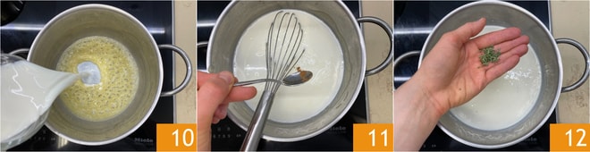 Gießen Sie nun die warme Milch dazu 10, würzen Sie mit Muskatnuss 11 und Thymian 12, und kochen Sie weiter bei schwacher Hitze, bis die gewünschte Konsistenz erreicht ist. Es dauert 5-6 Minuten, um eine mittlere Dichte zu erreichen.