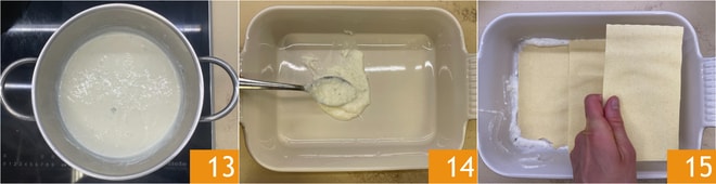 Wenn die Béchamelsauce fertig ist 13, verteilen Sie ein paar Löffel auf dem Boden einer Auflaufform von 26x18 cm 14, dann legen Sie die Nudelblätter darauf 15.