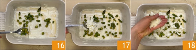 Bedecken Sie die Blätter mit der Béchamelsauce, dann fügen Sie die Spargel 16, die zerrissene Mozzarella 17 und den geriebenen Parmigiano Reggiano hinzu 18.