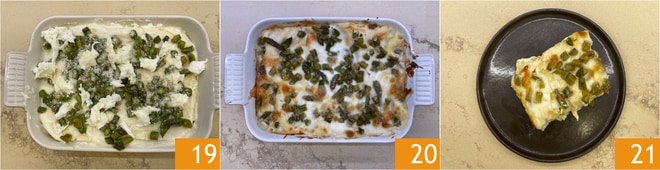 Setzen Sie die Schichten auf diese Weise fort, bis die Zutaten aufgebraucht sind 19. Backen Sie im statischen Ofen bei 180° für 20 Minuten, dann schalten Sie den Grill bei 200° ein und backen Sie weitere 5 Minuten 20. Ihre Spargel-Lasagne ist bereit zum Genießen 21!