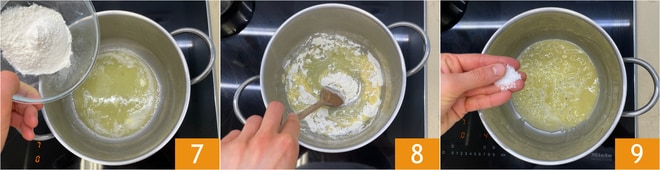 Fügen Sie das Mehl hinzu 7 und rühren Sie kräftig, um Klumpenbildung zu vermeiden 8. Mit Salz abschmecken 9 und weiter rühren, bis eine goldene Masse, das Roux, entstanden ist.