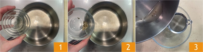 Um Spargel mit weißen Bohnen und holländischer Sauce zuzubereiten, geben Sie als Erstes Wasser, Essig 1 und zerstoßenen weißen Pfeffer 2 in einen kleinen Topf. Reduzieren Sie die Mischung um 1/3, lassen Sie sie abkühlen, filtern Sie sie durch ein feines Sieb 3 und stellen Sie sie beiseite. Sie wird später zur Zubereitung der holländischen Sauce verwendet.