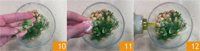 Geben Sie die Bohnen in eine Schüssel, fügen Sie wilden Fenchel und Majoran hinzu 10. Würzen Sie mit Salz 11, Öl 12 und mischen Sie alles.