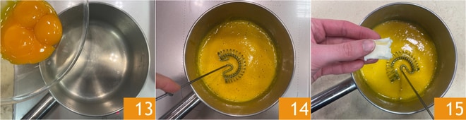 Fahren Sie mit der Zubereitung der holländischen Sauce fort. Fügen Sie die Eigelbe 13 zu der Reduktion im Topf hinzu. Zerdrücken Sie sie und erhitzen Sie sie bei sehr niedriger Flamme, während Sie kontinuierlich mit einem Schneebesen rühren und die Ränder nicht vernachlässigen 14. Sie dürfen nicht über 60 °C erhitzen. Nehmen Sie die Mischung vom Herd und fügen Sie nach und nach die Butter hinzu 15, während Sie ständig rühren. Sie sollten eine glatte und glänzende Masse erhalten.