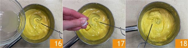 Fügen Sie nun weiterhin rührend den Zitronensaft 16 und das Salz 17 hinzu. Die holländische Sauce ist fertig 18.