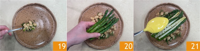 Sie können das Gericht anrichten, indem Sie die Bohnen auf dem Boden des Tellers platzieren 19, mit dem Spargel fortfahren 20 und mit einem Löffel holländischer Sauce bedecken 21.