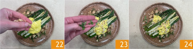 Vervollständigen Sie das Gericht mit den gerösteten Haselnüssen 22 und ein paar Majoranblättern 23. Ihr Spargel mit weißen Bohnen und holländischer Sauce ist bereit zum Genießen 24!