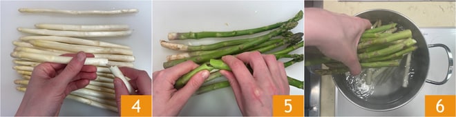 Wenden Sie sich nun der Wie man Spargel putzt zu. Entfernen Sie den holzigen Teil sowohl vom weißen als auch vom grünen Spargel 4 5. Blanchieren Sie sie 5 Minuten lang 6, lassen Sie sie abtropfen und geben Sie sie in eine Schüssel. Würzen Sie sie mit Salz und Öl.