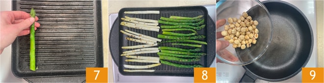 Legen Sie sie auf eine heiße Grillplatte 7, grillen Sie sie von allen Seiten 8 und stellen Sie sie beiseite. Rösten Sie die Haselnüsse schnell in einer Antihaftpfanne 9 und hacken Sie sie grob.