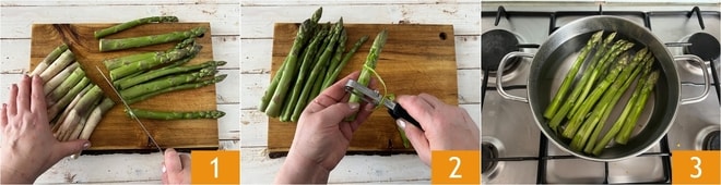 Um das Spargelpesto zuzubereiten, beginnen Sie zunächst mit der Reinigung. Entfernen Sie die holzigeren Enden 1 und schälen Sie den verbleibenden Teil des Stängels, wobei Sie die Spitzen intakt lassen 2. Insgesamt benötigen Sie etwa 220 g gereinigte Spargel. Blanchieren Sie die Spargel in gesalzenem Wasser für ca. 10 Minuten 3.