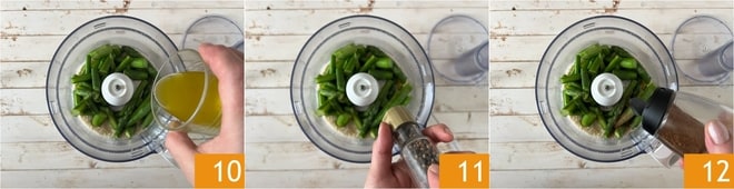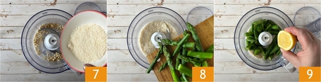 Fügen Sie den geriebenen Parmigiano Reggiano DOP und Pecorino hinzu 7 und mixen Sie noch ein paar Sekunden weiter. Fügen Sie nun die Spargel 8 und ein paar Tropfen Zitronensaft hinzu 9.
