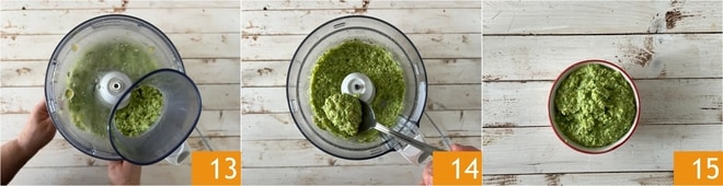 Schließen Sie den Mixer und mixen Sie in Intervallen 13, um das Gemisch nicht zu erhitzen. Sobald Sie eine cremige und rustikale Konsistenz erreicht haben 14, ist das Spargelpesto bereit zur Verwendung 15.
