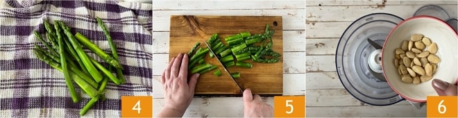 Die Spargel abgießen, mit einem Tuch abtupfen 4 und in Stücke schneiden 5. Geben Sie die Mandeln in einen Mixer 6 und zerkleinern Sie sie grob.