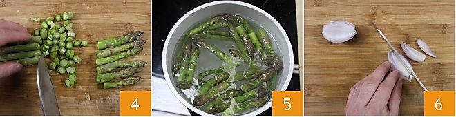 Schneiden Sie die Spargelstangen in kleine Ringe 4, während Sie die Spargelspitzen in wenig gesalzenem kochendem Wasser blanchieren, sodass sie bissfest sind 5; lassen Sie sie abtropfen und in einem Sieb abkühlen und das Kochwasser verlieren. Bewahren Sie sie für die abschließende Dekoration der Cremesuppe auf. Schälen Sie die Schalotte und schneiden Sie sie in dünne Scheiben 6,