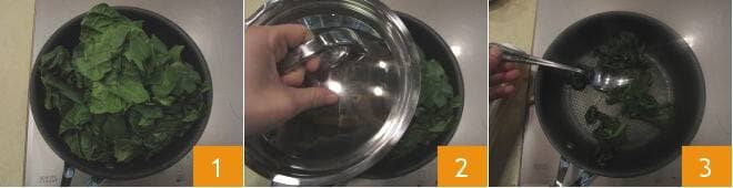 Um die Spinatspätzle mit Speck und Sahne zuzubereiten, waschen Sie zuerst die Spinatblätter und garen Sie sie in einer Pfanne bei mittlerer Hitze mit Deckel (1-2), bis sie gut zusammengefallen sind 3.