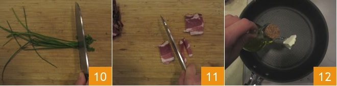 Bereiten Sie das Gewürz zu: Schneiden Sie den Schnittlauch fein 10 und schneiden Sie den Speck in Streifen 11. Erhitzen Sie Butter und Öl in einer Pfanne 12.