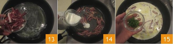 Fügen Sie den Speck hinzu 13 und lassen Sie ihn 2-3 Minuten braten, bis er knusprig ist. Geben Sie nun die Sahne 14, den Schnittlauch 15 hinzu, würzen Sie mit Salz und Pfeffer und lassen Sie es bei mittlerer Hitze eindicken, um das Gewürz cremig zu machen.