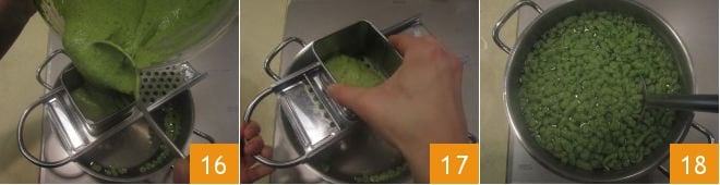 Alles ist bereit, um die Spätzle zu kochen: Stellen Sie einen Topf mit gesalzenem Wasser auf den Herd und bringen Sie es zum Kochen. Dann platzieren Sie den Spätzlehobel über den Topf und gießen Sie die Masse in den dafür vorgesehenen Raum 16, indem Sie das Gerät vor und zurück schieben, damit der Teig durch die Löcher fällt 17. Sobald die Spätzle mit dem kochenden Wasser in Kontakt kommen, werden sie in wenigen Augenblicken gar. Wenn die Spätzle anfangen, an die Oberfläche zu steigen 18,
