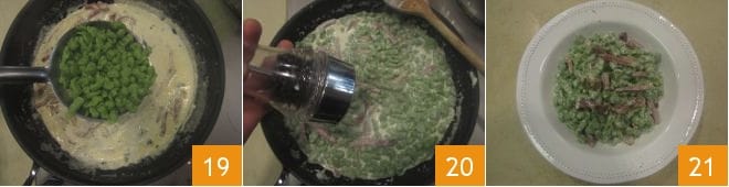 heben Sie sie nach und nach mit einer Schaumkelle direkt in die Sahne-Speck-Mischung 19, schwenken Sie sie für wenige Augenblicke, rühren Sie vorsichtig um, würzen Sie mit Pfeffer 20 und servieren Sie Ihre Spinatspätzle mit Speck und Sahne gut heiß 21!