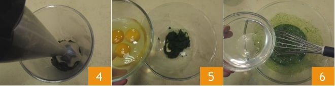 Geben Sie den Spinat in ein Gefäß und pürieren Sie ihn mit einem Stabmixer 4, bis eine cremige Masse entsteht. Dann geben Sie die ganzen Eier 5 und eine Prise Salz hinzu. Mischen Sie mit einem Schneebesen, um alles zu verbinden, und fügen Sie dann das Wasser hinzu 6.